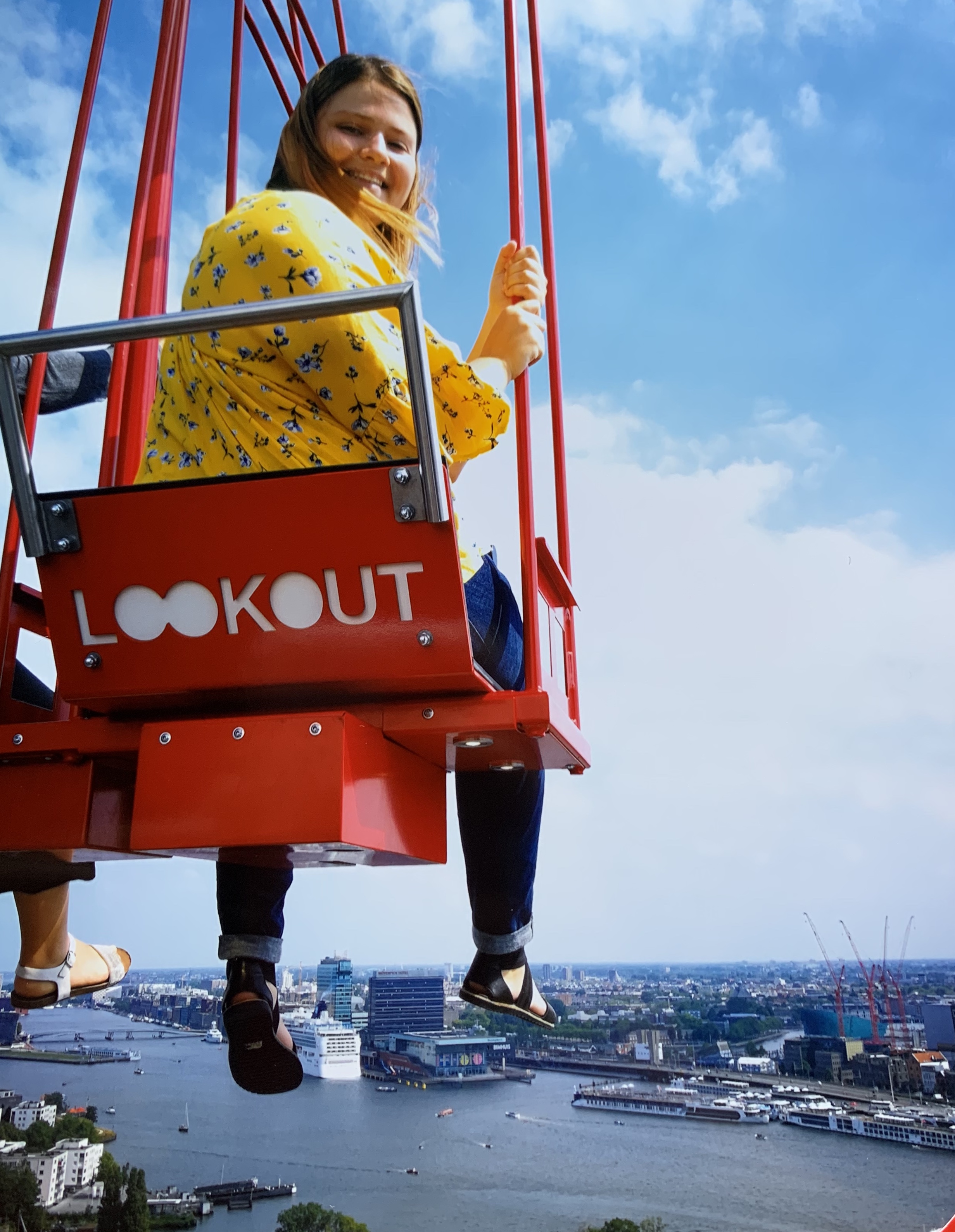 After spending about two and a half hours at the Amsterdam Museum, I made my way to A’DAM Lookout in Amsterdam North. Upon arriving I got my picture taken against a green screen backdrop that depicted me both sitting and pretending to fall off of a metal bar over the edge of Amsterdam and got to experience a light show on my way up to the 20-story rooftop. Once I got to the rooftop, I got to go on the over-the-edge swing and view the entire city from an indescribably breathtaking and exhilarating view. After my one minute swing ride I spent about an hour and a half exploring the amazing 360° view while enjoying some fresh strawberry and Oreo rolled ice cream.